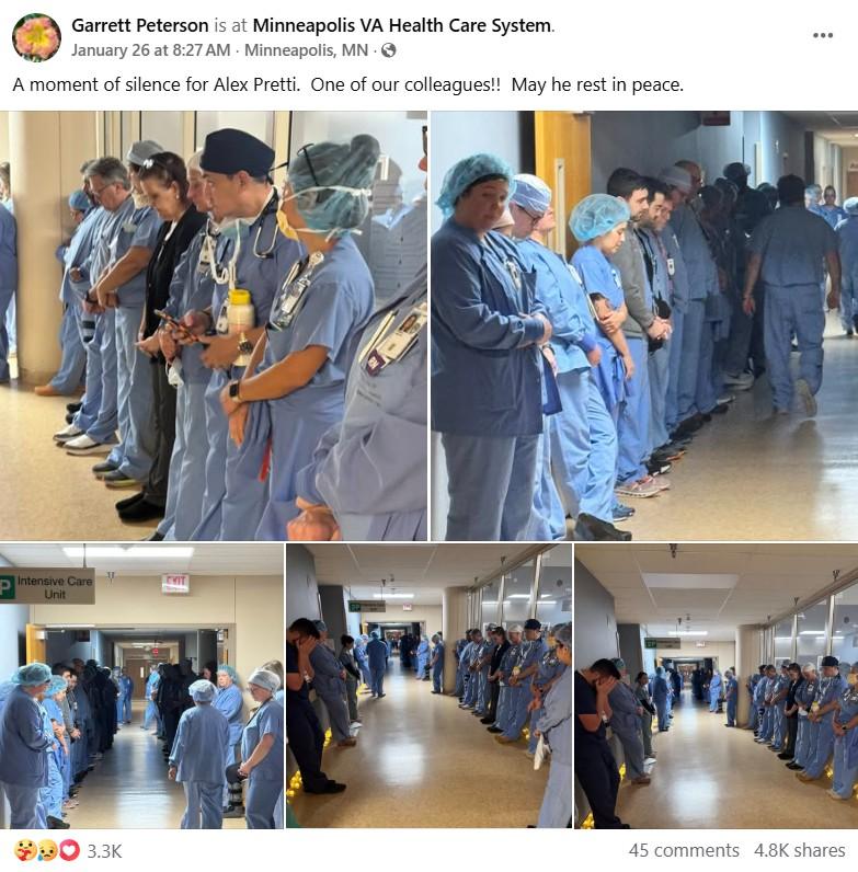 Additional keyword searches bring up a Facebook post from January 26 that appears to show an actual moment of silence staff at the Minneapolis VA held for Pretti (archived here).