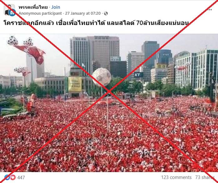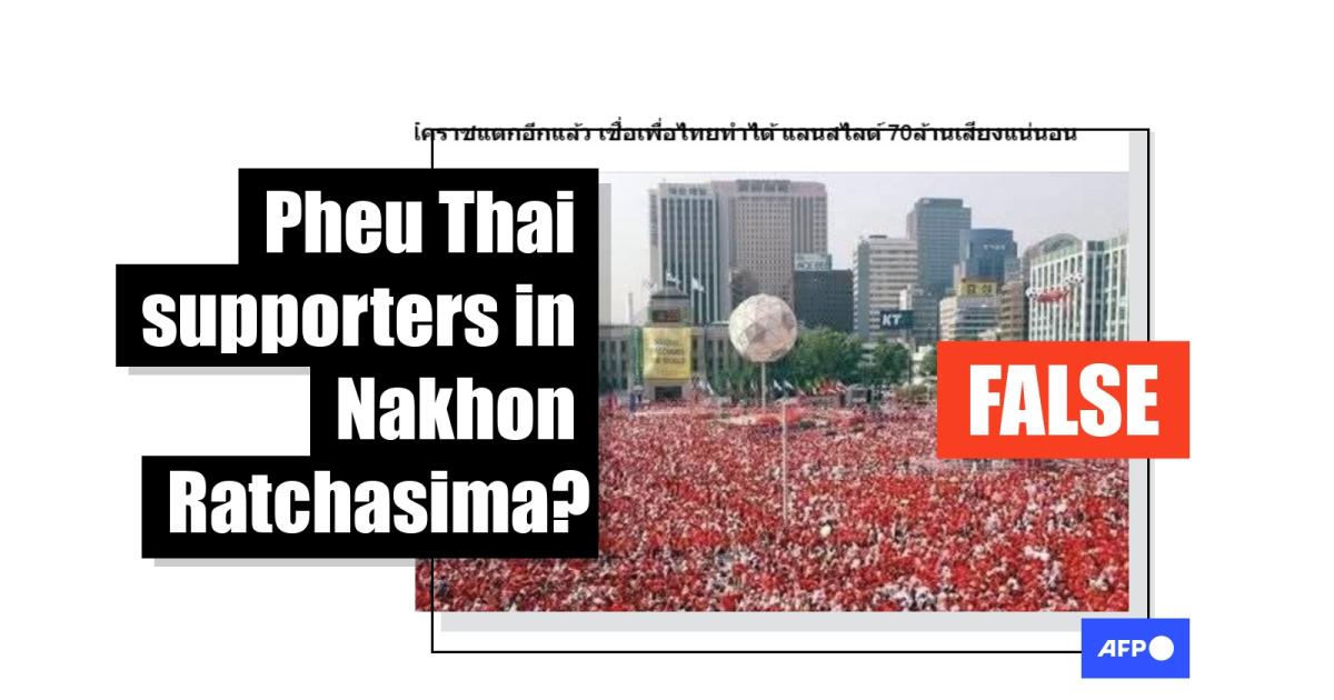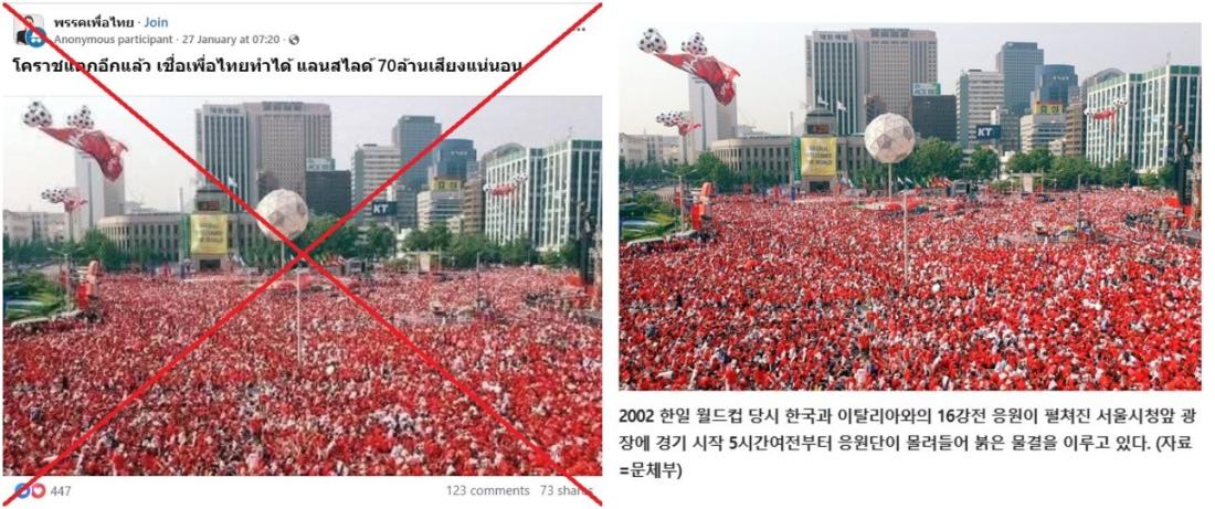 As campaigning kicked into full swing in Thailand ahead of a February 8 general election, an image of a huge crowd dressed in red was shared in posts falsely claiming it showed a rally of supporters of the populist Pheu Thai party. The image is in fact more than two decades old and shows South Korean football fans during the 2002 World Cup jointly hosted by the country and Japan.