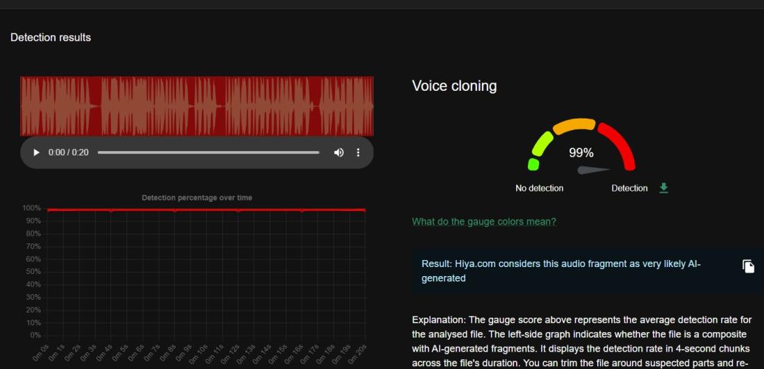 The results indicated a 99 percent probability that the audio was created artificially, emphasised at the 19-second mark when the voice jumps, a common indicator of digital manipulation.