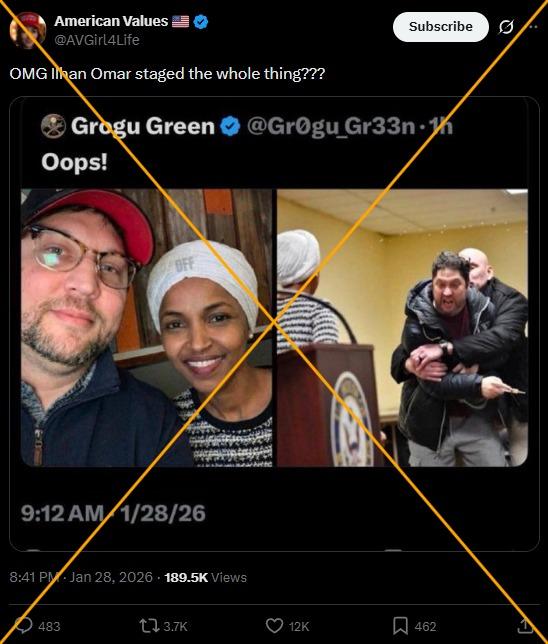 "OMG Ilhan Omar staged the whole thing???" says a January 28, 2026 X post.