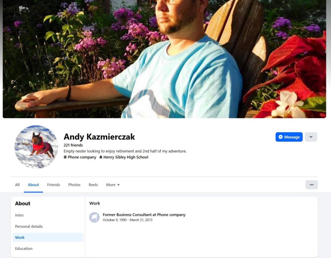 There is no evidence Kazmierczak worked for Omar or a winery. He described himself on Facebook as an "empty nester looking to enjoy retirement" and listed a previous job as a business consultant for a phone company.