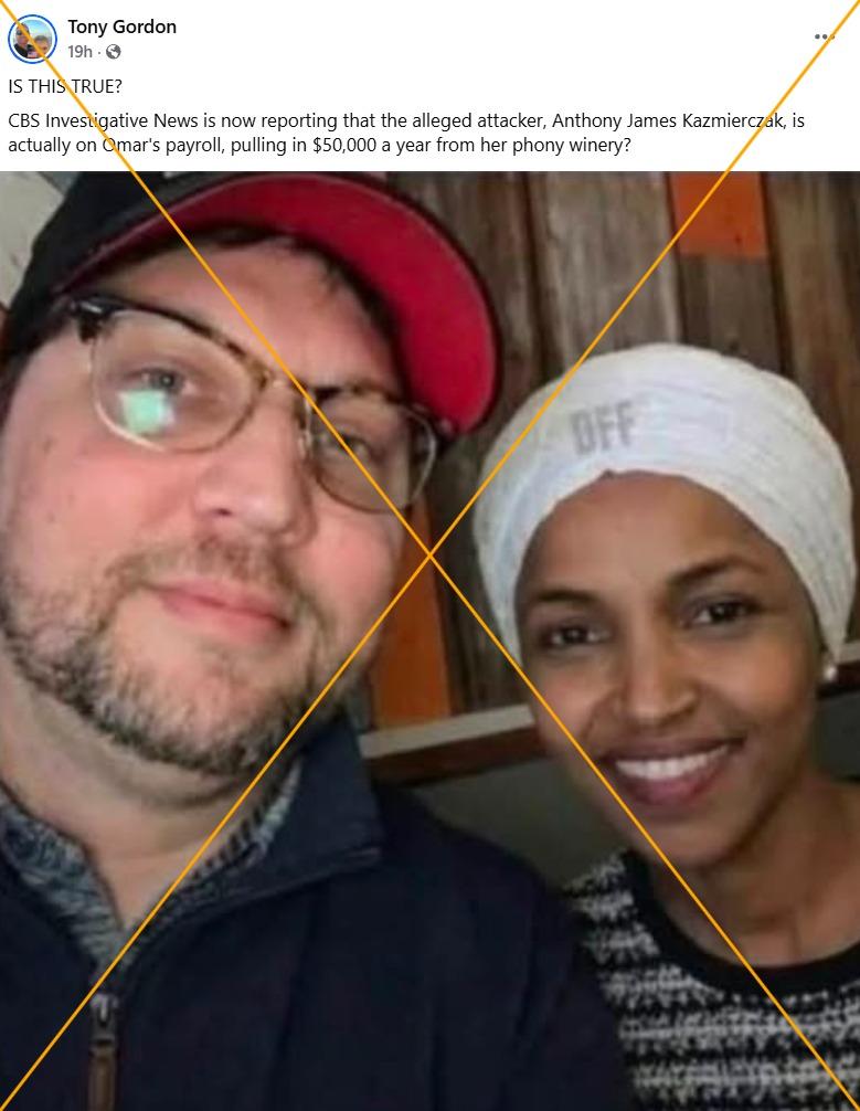 Additional Facebook posts include the same image of Omar smiling next to a man in glasses and a red brimmed baseball cap with the text: "CBS Investigative News is now reporting that the alleged attacker, Anthony James Kazmierczak, is actually on Omar's payroll, pulling in $50,000 a year from her phony winery?"