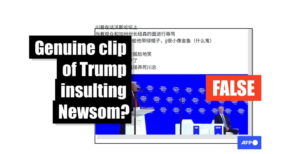 Donald Trump has sparred with California's Democratic Governor Gavin Newsom, but a video circulating online that appears to show the US president calling him "Newscum" during a speech at the World Economic Forum (WEF) is manipulated. While the footage is taken from the forum, it was overlaid with AI-generated audio and does not reflect Trump's actual remarks.