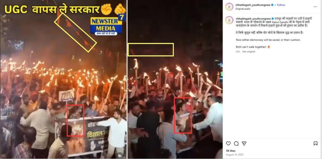 Another reverse image search using keyframes from the video showing protesters holding up torches and placards led to similar footage shared on Instagram by the Chhattisgarh Youth Congress on August 14, 2025 (archived link).