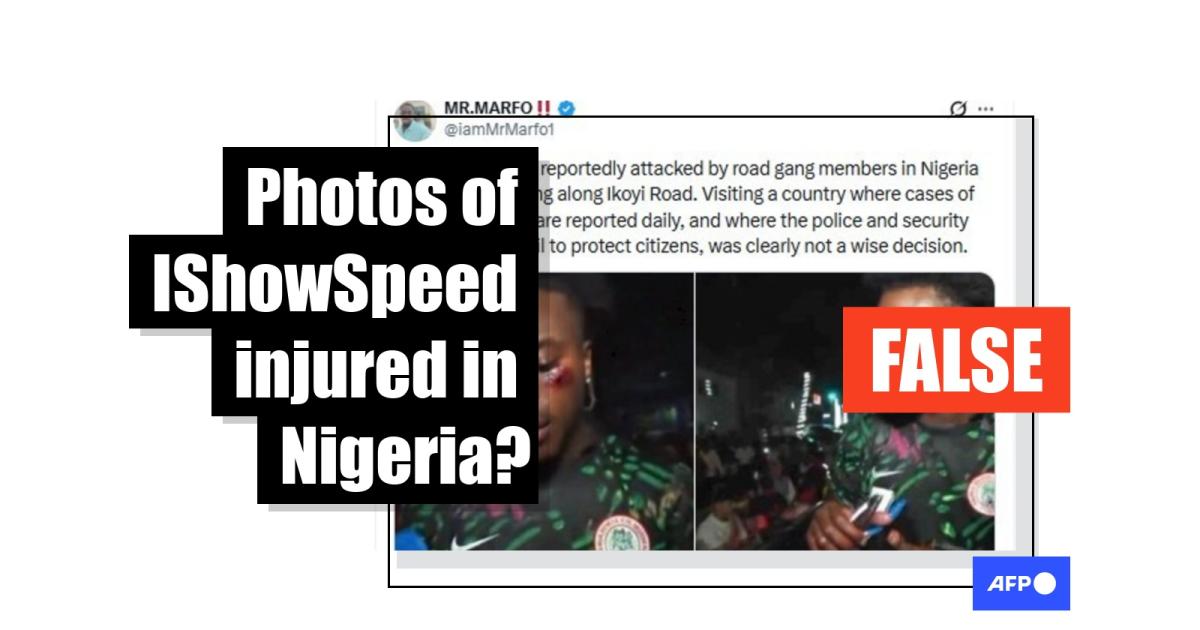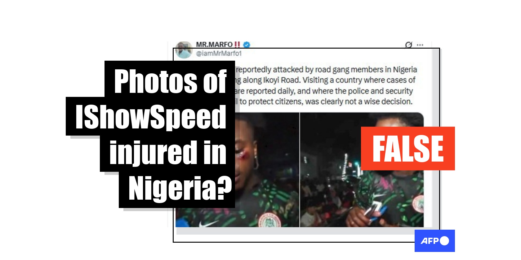 As part of his African tour, American YouTuber IShowSpeed stopped in Nigeria's economic and cultural capital, Lagos, where he celebrated his 21st birthday and surpassed 50 million YouTube subscribers. Just hours after his livestreamed visit, posts claiming the streamer had been attacked by a gang in Nigeria circulated widely on social media, accompanied by images purportedly showing him with a facial injury. However, the images were doctored, and there is no evidence that the content creator was attacked during his visit, which AFP journalists covered.
