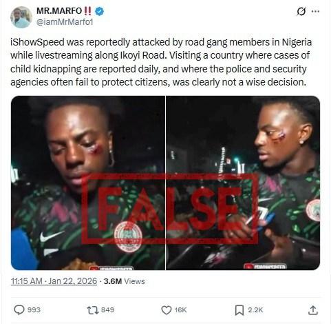 The post, shared more than 800 times, contains two screenshots from the Lagos stream, purportedly showing IShowSpeed with facial injuries.