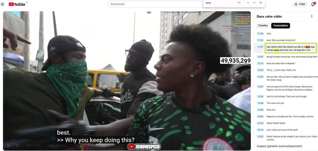 Additional keyword searches led us to a different moment at 11’54’’, when one of the streamer's bodyguards warns him about certain hand signs associated with gangs, after IShowSpeed greeted a passerby.