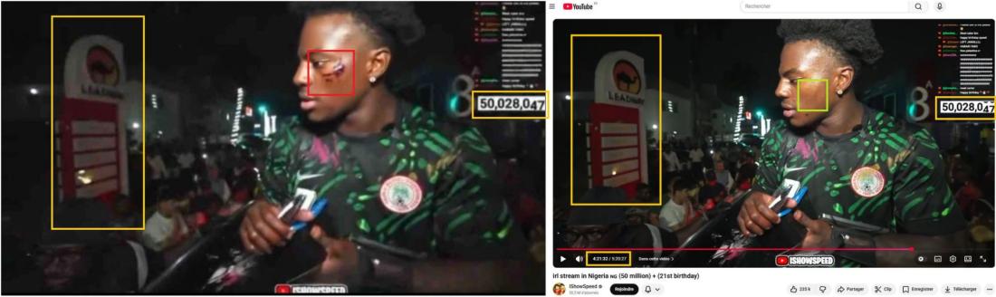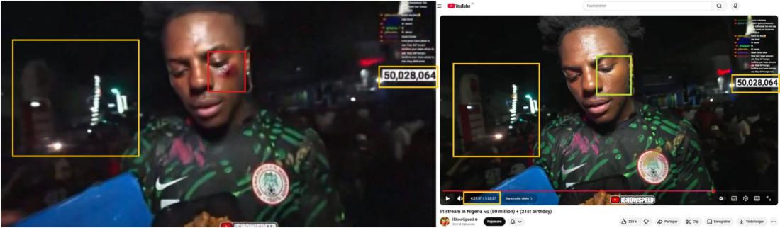 A comparison of the viral screenshots with the original stream footage reveals signs of manipulation: in the original video, IShowSpeed has no facial injuries.