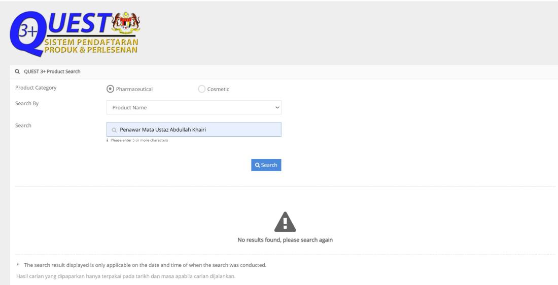 There is no record of the touted product in Malaysia's National Pharmaceutical Regulatory Agency (NPRA) database, indicating it has not been approved by Malaysian health authorities (archived link).