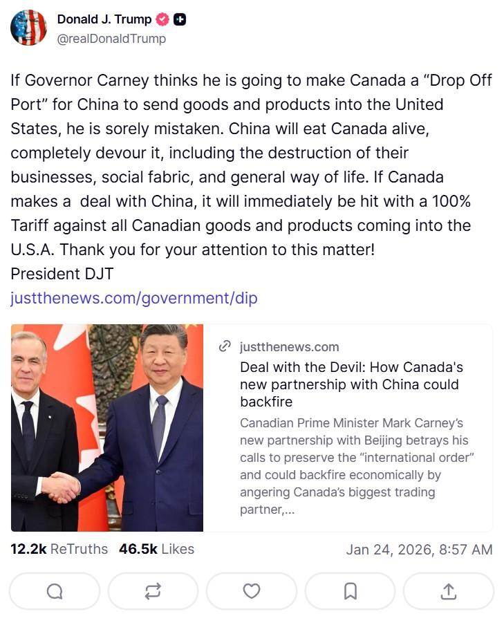 The most recent post where Trump mentioned Carney came on January 24, 2026 and threatened Canada with a "100% Tariff" if Ottawa finalized a new trade deal with China. He did call Carney "governor," reviving an insult he had previously directed at former prime minister Justin Trudeau, who Trump said was leading the 51st US state rather than an independent country.
