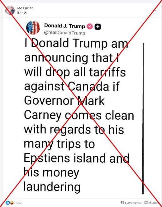 "I Donald Trump am announcing that I will drop all tarriffs against Canada if Governor Mark Carney comes clean with regards to his many trips to Epsteins Island and his money laundering," Trump is quoted as saying in the apparent screenshot of his Truth Social account, which was shared to Facebook on February 2, 2026.