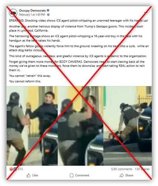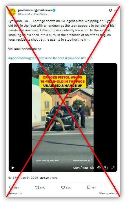 "Footage shows an ICE agent pistol whipping a 16-year-old boy in the face with a handgun as the teen appears to be raising his hands and unarmed," says a January 31, 2026 post sharing the video on X. "Other officers violently force him to the ground, kneeling on his back into a curb."