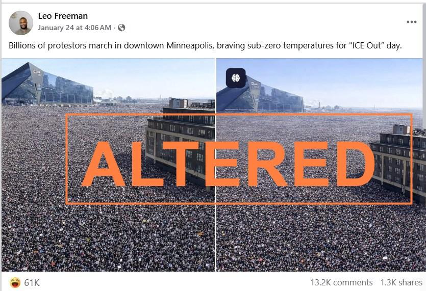 A similar Facebook post from the US claims: “Billions of protestors march in downtown Minneapolis, braving sub-zero temperatures for ‘ICE Out’ day.”