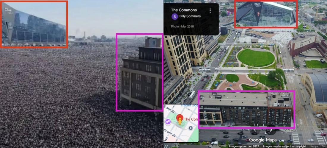 Through geolocation, we identified the two prominent buildings in the image as the US Bank Stadium and the Edition Apartment Homes, with the majority of the crowd gathered in the open space between them known as The Commons.