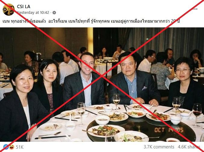 The image of Anutin at a dinner table with Mauerberger, also known as Ben Smith, and three other women spread in a February 7 Facebook post from a page called "CSI LA", which frequently shares claims about corruption amongst Thai officials.
