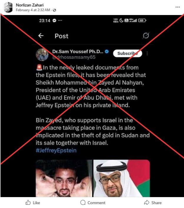 "In the newly leaked documents from the Epstein files, it has been revealed that Sheikh Mohammed bin Zayed Al Nahyan, President of the United Arab Emirates (UAE) and Emir of Abu Dhabi, met with Jeffrey Epstein on his private island," reads text on a screenshot shared on Facebook on February 4, 2026.