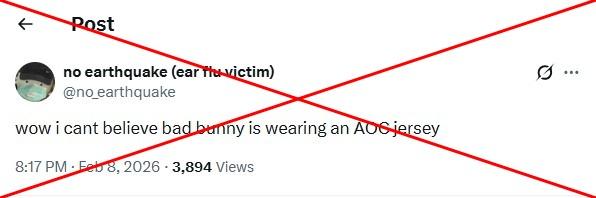 Social media posts claim that Puerto Rican artist Bad Bunny used his performance at the 60th annual Super Bowl Halftime Show to make a show of political support for US Representative Alexandria Ocasio-Cortez by wearing a jersey bearing the name "Ocasio." However, there is no evidence the reference was anything other than a nod to the performer's name Benito Antonio Martínez Ocasio.