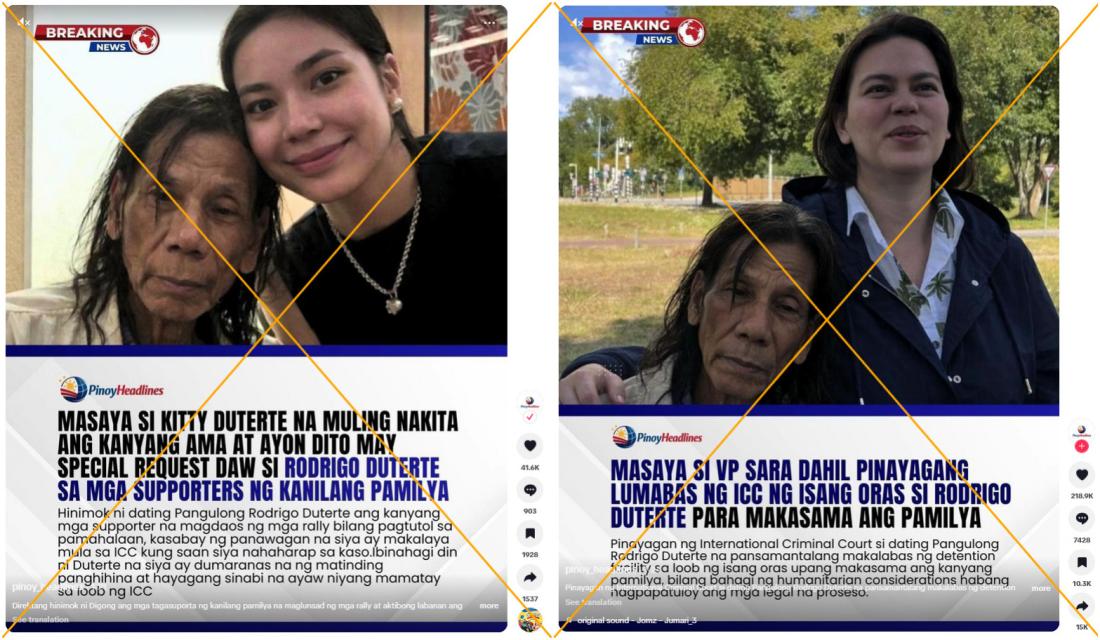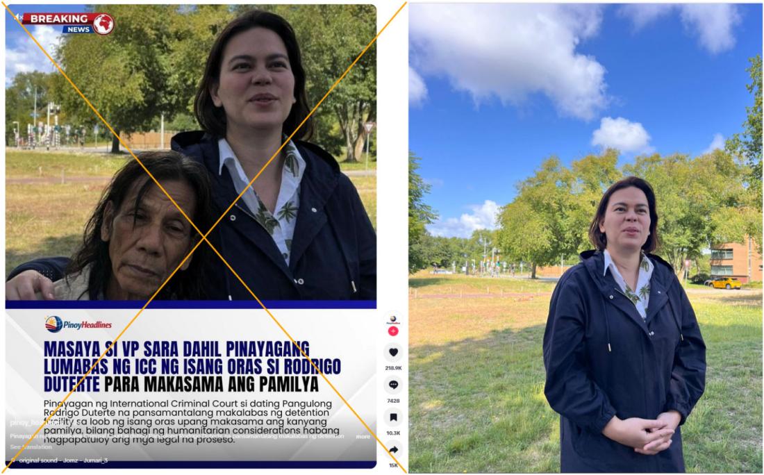 Prior to International Criminal Court (ICC) judges ruling that former Philippine president Rodrigo Duterte was fit to take part in pre-trial hearings starting February 23, manipulated images depicting the 80-year-old in very poor health were shared on social media. The images were doctored from a more than year-old photo of Duterte with his youngest child and another that originally only showed his eldest daughter, Vice President Sara Duterte.