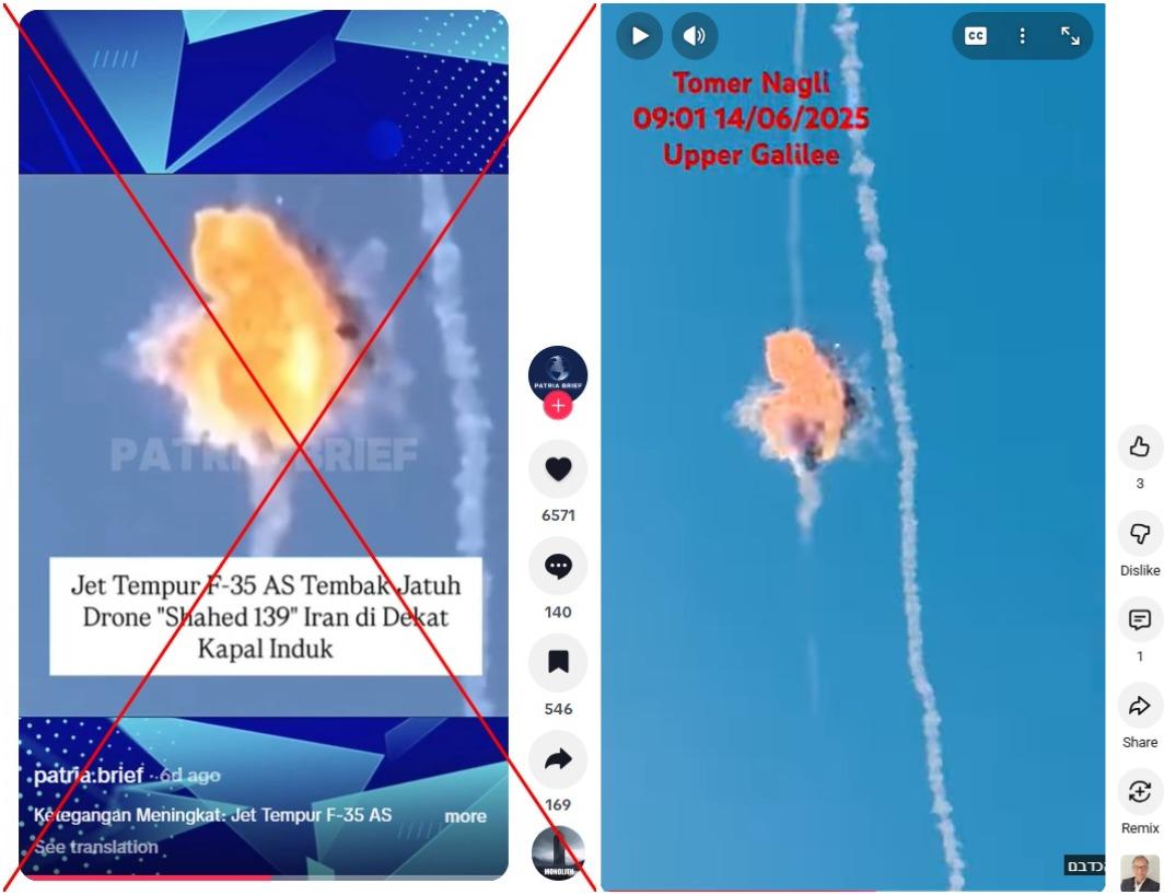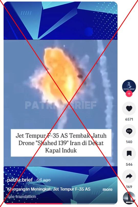 "US F-35 fighter jet shoots down Iranian 'Shahed 139' drone near an aircraft carrier," reads part of the Indonesian-language text on a TikTok video shared on February 5, 2026.