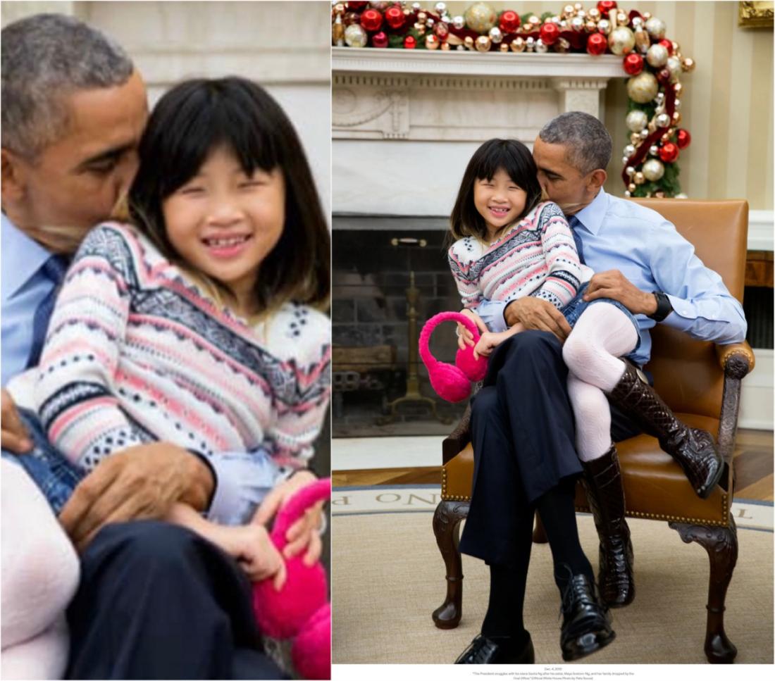 "The President snuggles with his niece Savita Ng after his sister, Maya Soetoro-Ng, and her family dropped by the Oval Office," reads the photo's caption.