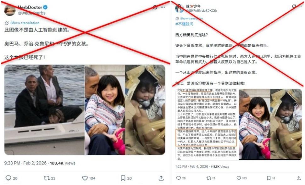 "This image was not created by artificial intelligence. Obama, George Clooney, and a 9-year-old girl. The girl is dead!" reads the simplified Chinese caption of two images shared in an X post from February 2, 2026.