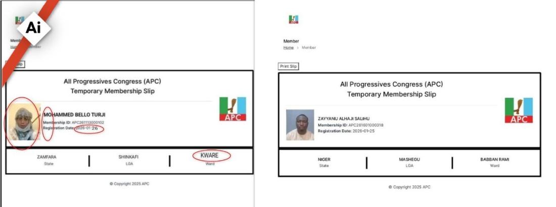 A temporary membership card shared on Instagram by a media aide of the governor of Niger state, Umar Bago, shows the correct format and style (archived here).