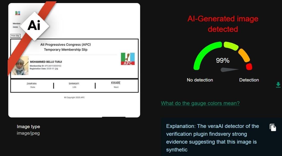 Although the card may have been altered using regular editing software, analysis conducted using the VeraAI detector tool suggests a 99 percent probability that the membership card purportedly belonging to Turji was AI-generated.