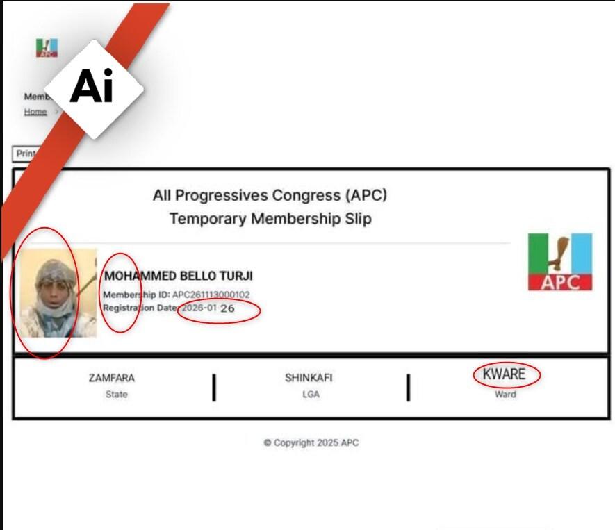 "All digital parameters represented on the fake slip bear no connection to our party’s membership register," it reads. "For example, the slip purports to be registered in a nonexistent ‘Ward 13’ of Shinkafi Local Government Area of Zamfara State, which only has 10 Wards. All other information paraded on the fake slip are nonexistent (sic)."