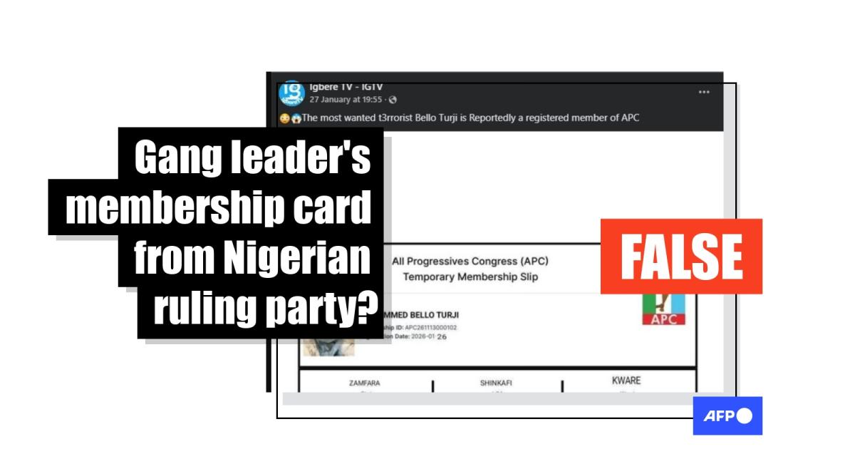 Insurgents and criminal gangs continue to sow havoc in Nigeria, prompting the arrival this month of US troops. An image of a ruling party membership card purportedly belonging to Bello Turji, described by the government as a “terrorist”, has circulated widely on social media. However, the image contains visual inconsistencies typical of digitally created content. The party dismissed the image as fake.