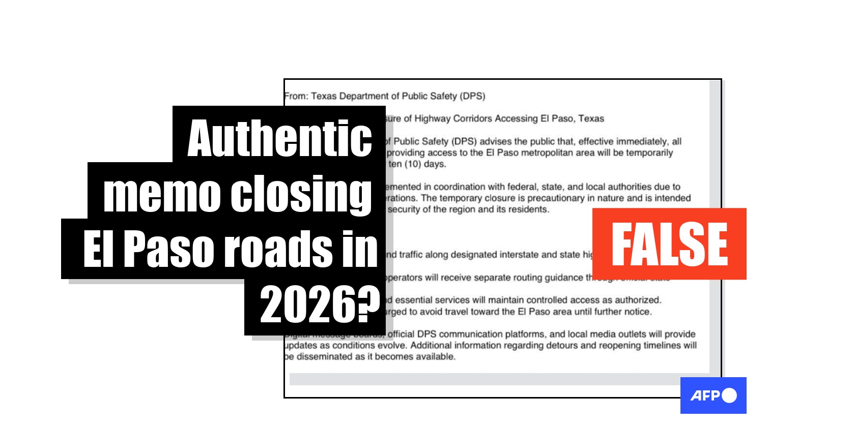 "This is a fake memo, and DPS is NOT closing the major highways -- or any roads -- in or out of the area over the next 10 days," the Texas Department of Public Safety said in February 11 statement published on its official website and social media channels (archived here and here).