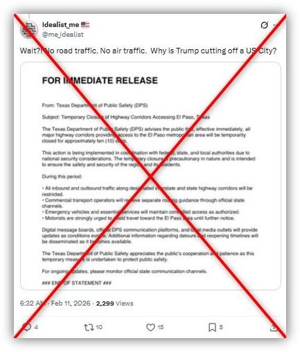 Texas state Senator Cesar Blanco also said in a February 11 post on X that his office had spoken with state authorities and confirmed "there are no operations being implemented that would result in road closures" (archived here).