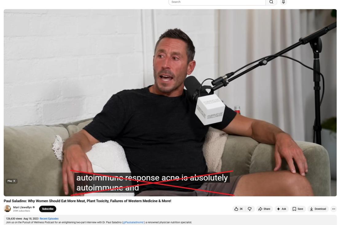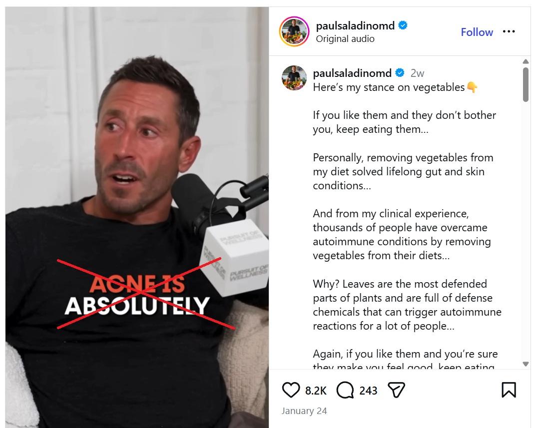 "Acne is absolutely autoimmune," says Paul Saladino, a doctor who helped popularize the "carnivore diet," in a January 24, 2026 Instagram reel.
