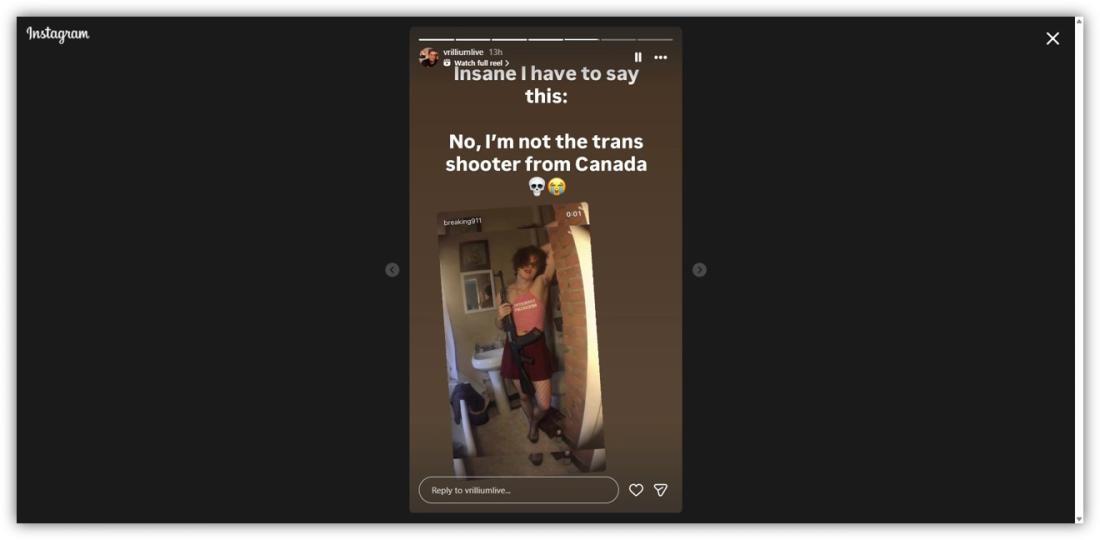 In a February 11 story on Instagram, where his name is listed as William Sexton, Vrillium shared the image and wrote: "Insane I have to say this: No, I'm not the trans shooter from Canada."