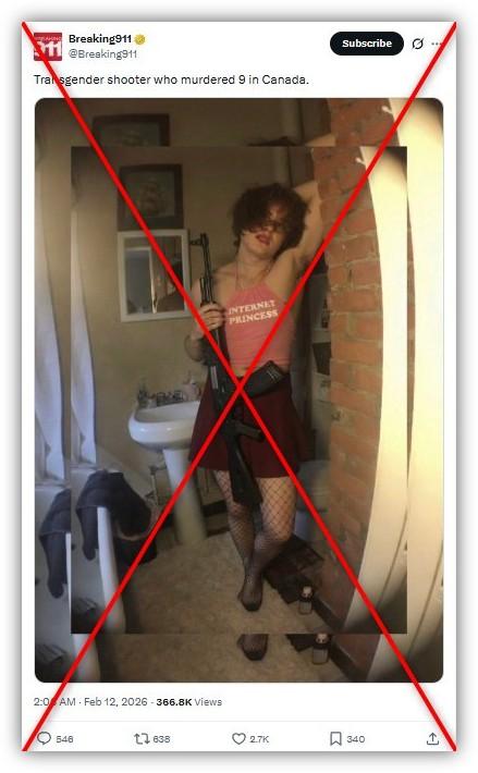 "Transgender shooter who murdered 9 in Canada," says a February 11, 2026 post on X and Instagram from "@Breaking911," a widely followed account that AFP has previously fact-checked for spreading misinformation.