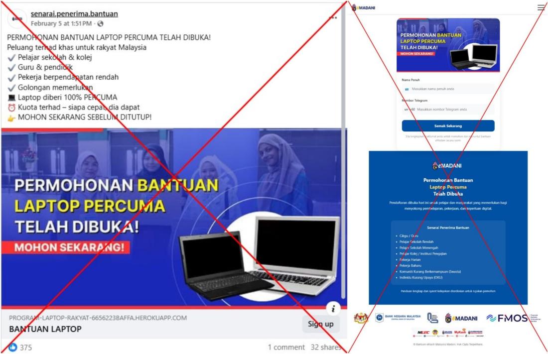Posts lure Malaysian users to imposter government website with bogus laptop offer