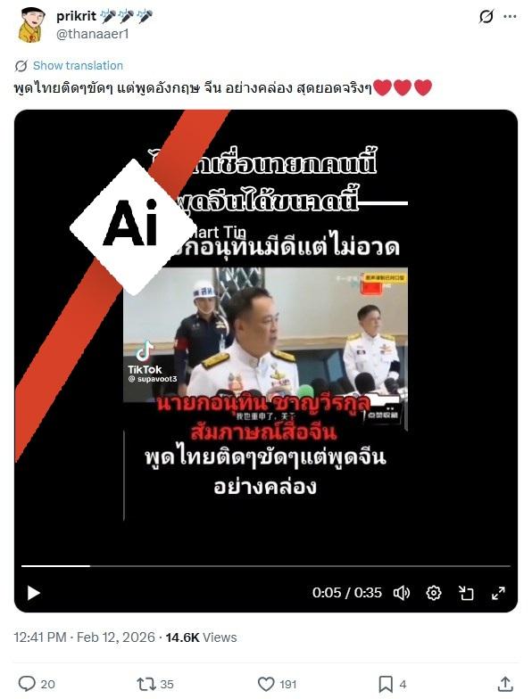 "He stutters in Thai, but he's fluent in English and Chinese, amazing!" reads the Thai-language caption of an X video shared on February 12, 2026.