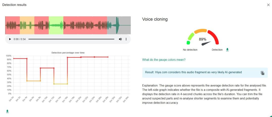 An analysis of the audio in the doctored video using the voice cloning detection tool Hiya, available in the Verification Plugin, found it is "very likely AI-generated".