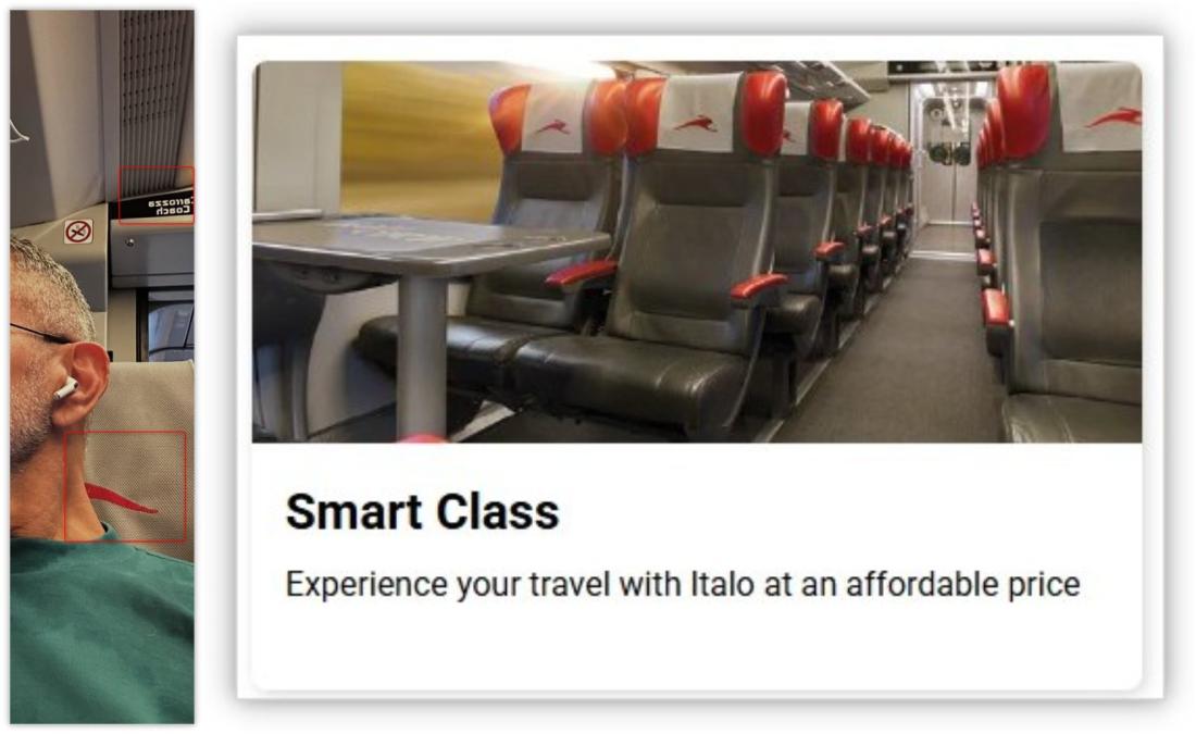 Part of the company’s logo – a leaping hare – can be seen on the headrest, matching images from Italo’s website. When flipped, a sign above the doorway reads “Carrozza Coach”. In Italian, “carrozza” means “carriage”.