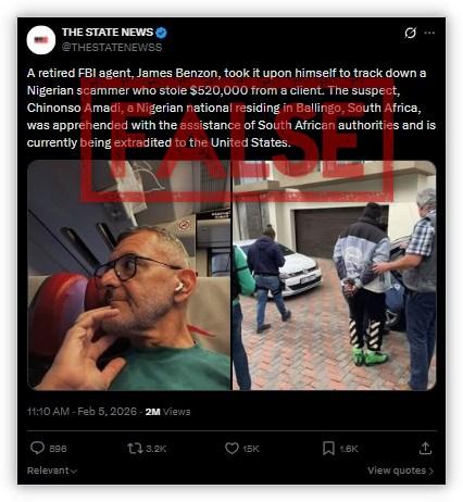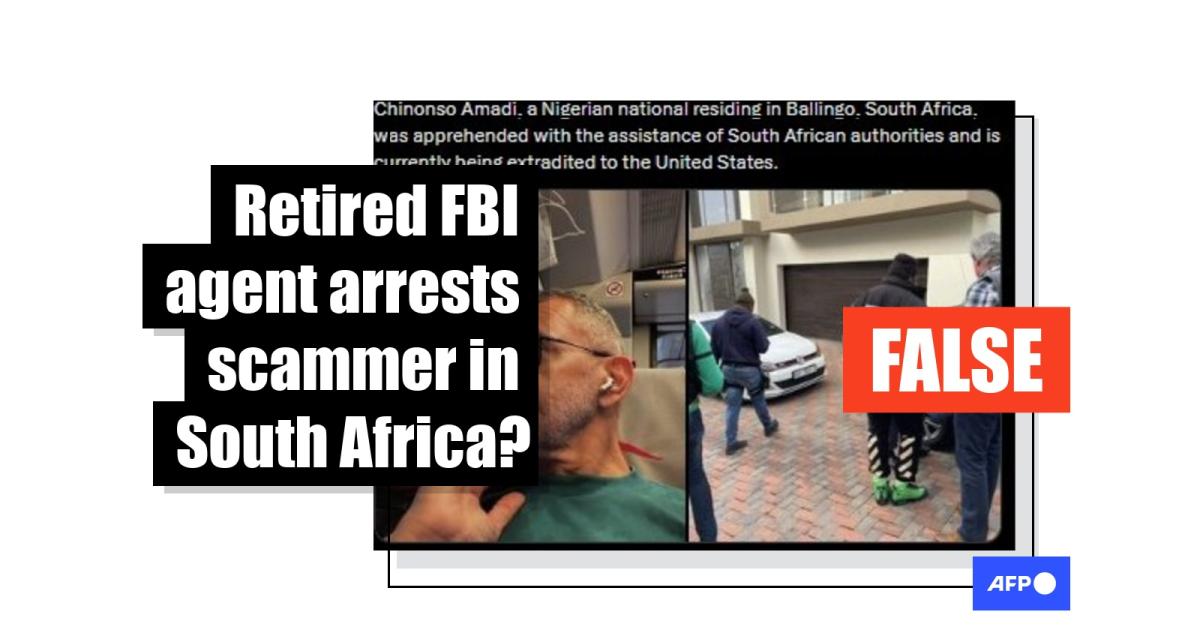 Authorities monitoring a global cybercrime syndicate made a breakthrough in 2022 when they arrested a Nigerian man in South Africa on wire fraud and money laundering charges. Four years later, social media posts claimed that a retired FBI agent had tracked down a "Nigerian scammer" in South Africa, leading to his arrest. However, the post features two old and unrelated images, and South African police confirmed that the claim is false.