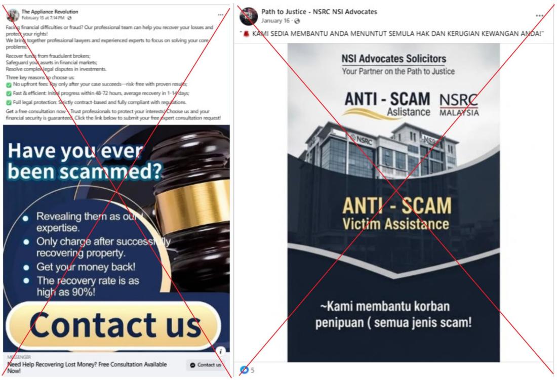 Scams posing as legitimate law firms offering money recovery services are also on the rise in Malaysia, with police receiving reports from victims who were lured by social media ads claiming expertise in digitally tracing lost funds (archived here, here and here).