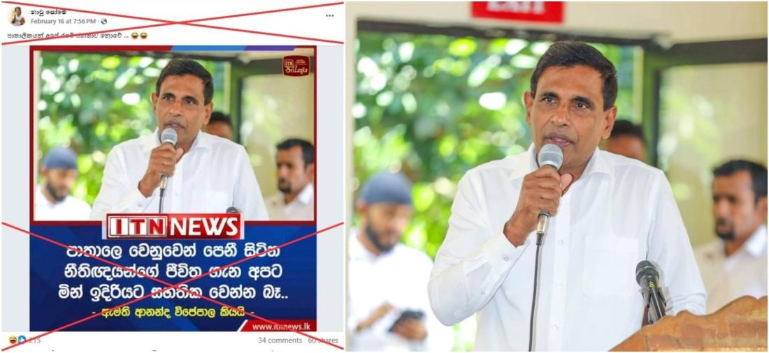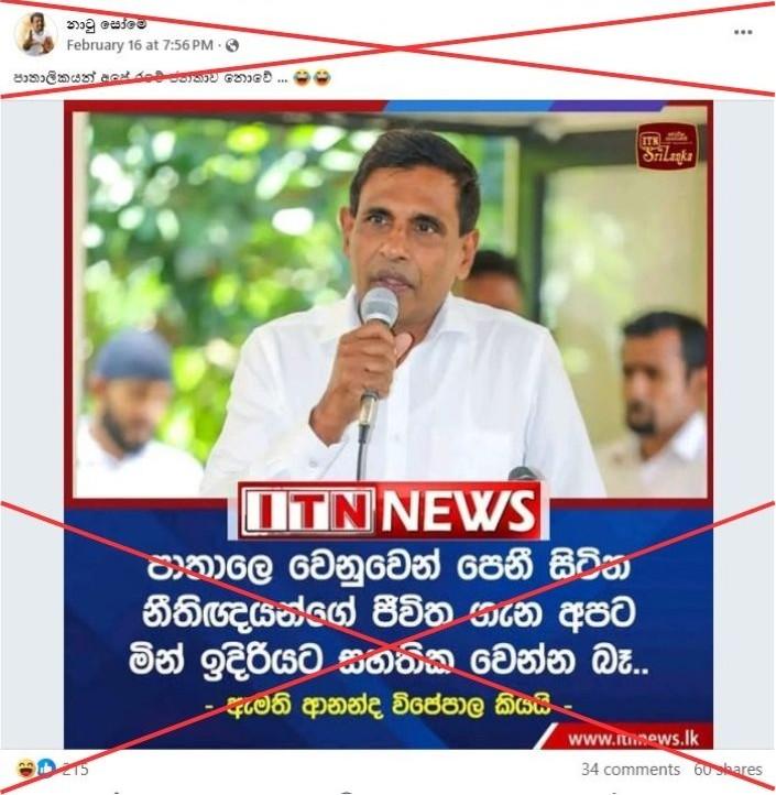 Hasini Ekanayake, the head of ITN News Digital Department also told AFP via WhatsApp on February 23: "ITN has not published or broadcast any report containing the quoted statement attributed to Minister Ananda Wijepala".