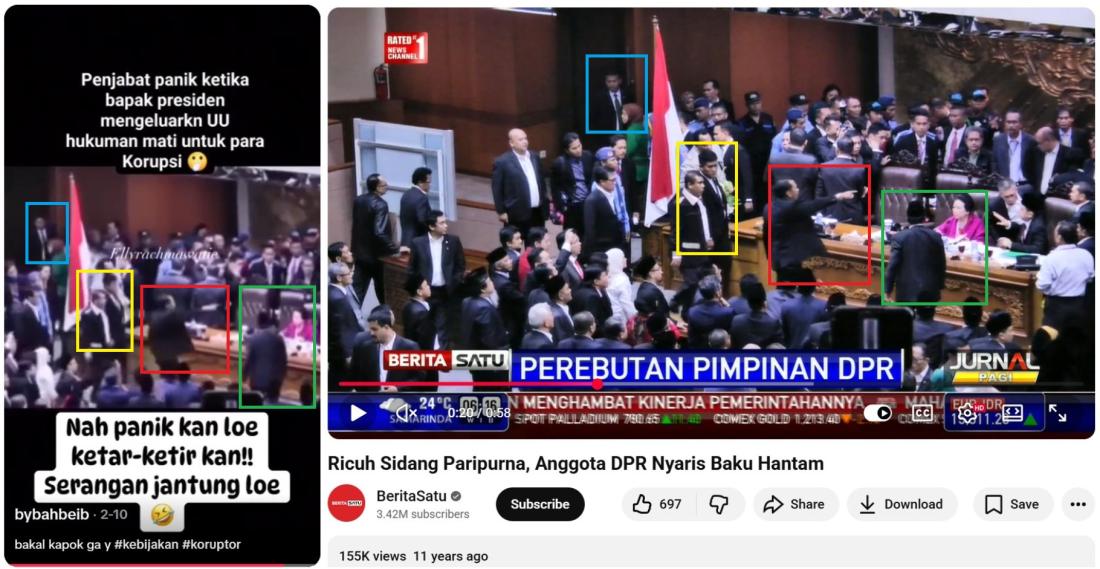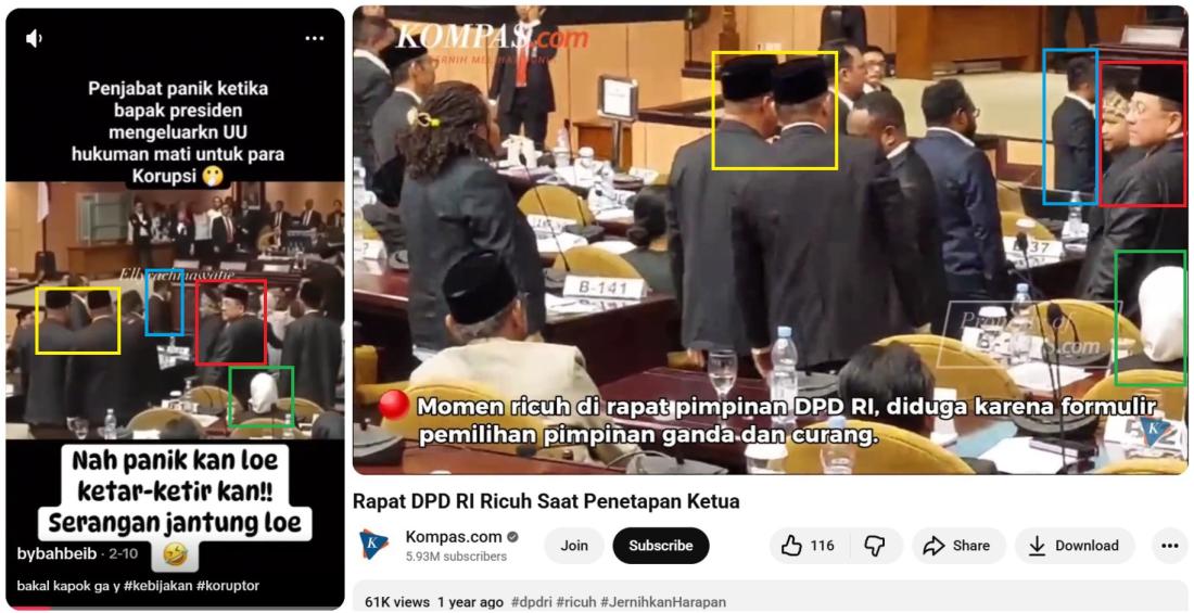 The first clip was published by Indonesian broadcaster Kompas TV on October 1, 2024 in a report about chaos breaking out during a Regional Representatives Council (DPD) meeting, when members of the council criticised the mechanism for choosing its chairman (archived link).
