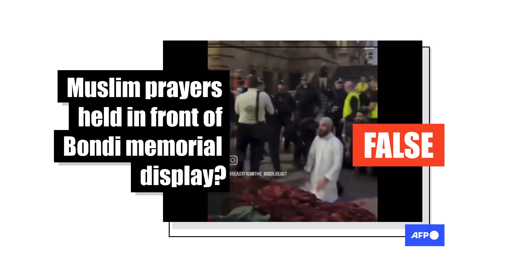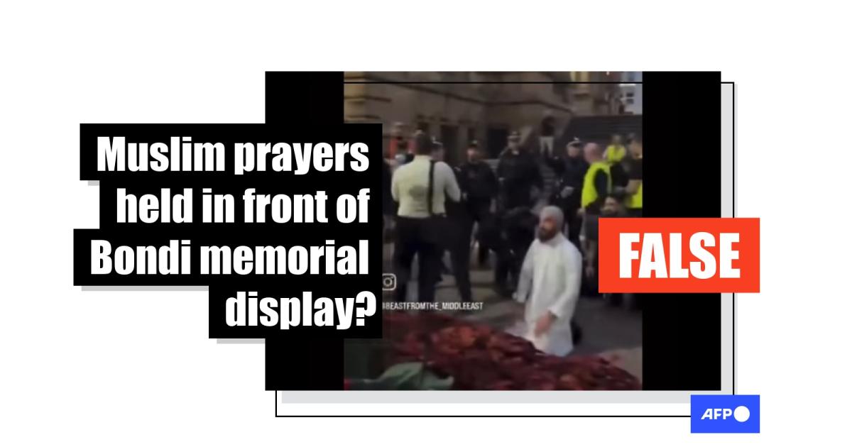 After a group of Muslims praying in Sydney was forcibly removed amid a demonstration against the visit of Israeli President Isaac Herzog in February 2026, posts shared a false claim that they were praying in front of a display memorialising the victims of the antisemitic Bondi Beach shooting. There were no memorials at the site of the scuffle and police told AFP that a senior officer had okayed the prayers.