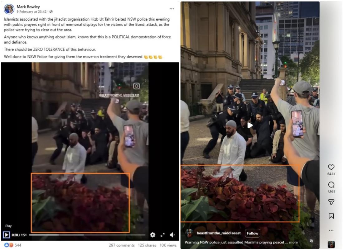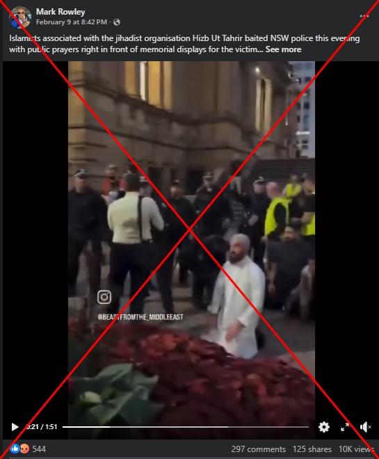 "Islamists... baited NSW police this evening with public prayers right in front of memorial displays for the victims of the Bondi attack, as the police were trying to clear out the area," reads a February 9, 2026, Facebook post shared 125 times.