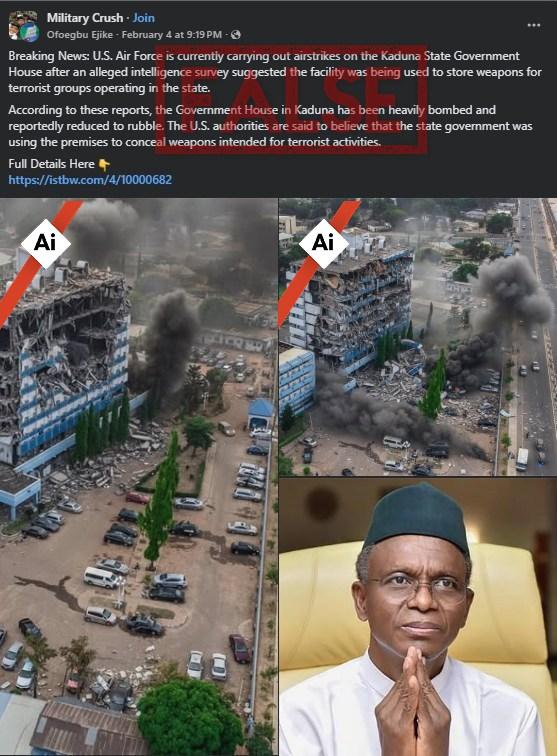 “Breaking News: U.S. Air Force is currently carrying out airstrikes on the Kaduna State Government House after an alleged intelligence survey suggested the facility was being used to store weapons for terrorist groups operating in the state,” reads part of a Facebook post shared on February 5, 2026.
