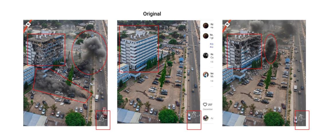 The second image appears to have a warping effect, making the building look as if it’s melting along the exposed floors and facade edges. The rubble piles at the bottom also do not match the building’s original structure.