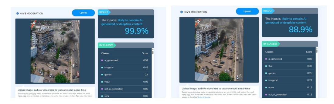 Analyses of the images using Hive Moderation, an AI detection tool, found a probability of 88.9-99.9 percent that they were artificially generated.