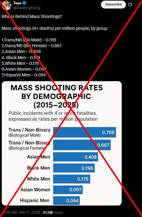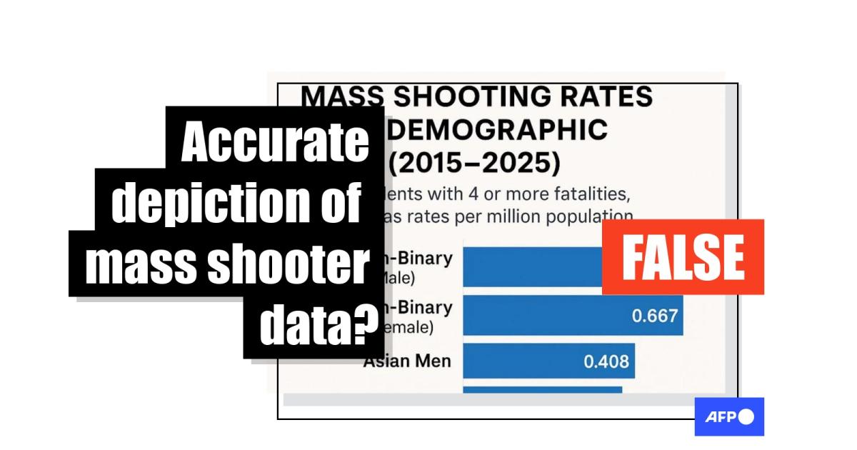 A chart that frames transgender people as responsible for more mass shootings than individuals from any other demographic group has resurfaced online in the wake of deadly events in Canada and the United States. But the data, which was first posted to X in 2025, does not accurately depict crime statistics, experts told AFP.