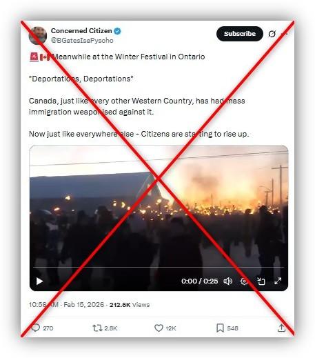 "Meanwhile at the Winter Festival in Ontario. 'Deportations, Deportations,'" says a February 15, 2026 post from the conspiracy-laden X account "Concerned Citizen," which has repeatedly peddled disinformation. "Canada, just like every other Western Country, has had mass immigration weaponised against it. Now just like everywhere else - Citizens are starting to rise up."