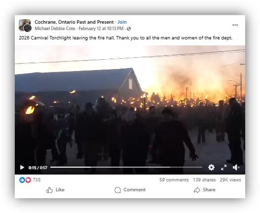Reverse image searches surfaced what appears to be the original version of the video posted February 12, 2026 to a Facebook group titled, "Cochrane, Ontario Past and Present" (archived here).